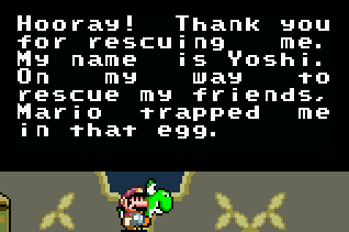 Upon reaching Yoshi's Island 2, I found that it had been renamed to YOSHI'S HOUSE, the original name of level 104. I decided to enter and found that the palette of the level had been changed along with the background. They seemed to have been changed to the same palette as Yoshi's Island 3, you know, greenish tan and such, except the background was pushed down some and was now a rotting brown color, and that the vegetation on the FG was now no longer present. I decided to explore the level a bit and came across the trail of Koopas, that countless players have used a shell to rack free 1-Up's with. I decided to ignore them and go see if any more of the level was changed. I eventually came across the "?" that holds Yoshi and decided to free him. Upon freeing him, I got this message: