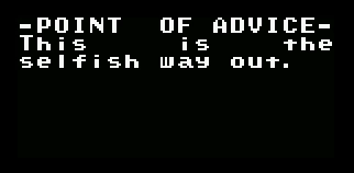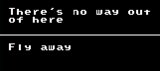 I found it quite strange that both message boxes were contradicting each other. One was telling me that there was no way out of this accursed hell, and the other was telling me that, if I could fly away, I could be free, though I saw no feather or enemies to grab one with. Was this telling me that I could either rise up and go to heaven, or stay in hell forever, wallowing in despair?