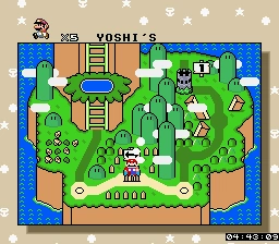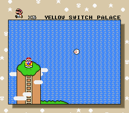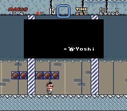 Upon reaching the end I saw a Fire Flower in the top block where the 4-way block intersection used to be, however it was too high for me to reach by normal means, so I just continued onward, like the blind, curious idiot I am would do. So I finally beat the level, and as usual the path to the Yellow Switch Palace was unlocked. I decided to head up the path that normally leads to the Yellow Switch Palace, and I found that when I entered the main overworld, every other landmass and decoration besides the ghosts from the Ghost Houses and Yoshi's island itself were gone. Nothing really changed at the Yellow Switch Palace except for the switch message. All that changed was that -SWITCH PALACE- was changed to -MARIO WORLD-. Boring. Anyways, just when I thought I was done with this abomination that calls itself a hack, I found that Yoshi's Island 2 has also been edited. "Oh, joy!" I thought to myself. (/sarcasm)