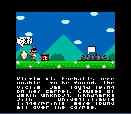 There was a door, which I entered. I was welcomed by nothing but a small section of land, and at that, the level was auto scrolling, so I figured that this must be the end, that the author wanted me to jump in the pit and commit suicide or something, thus ending my journey. I was wrong, the auto scroll pushed me over the ledge, and I was still walking, unfortunately. The whole level was nothing but a long stretch of invisible land to another small piece of land just big enough for a boss door to fit. The auto scroll came to a stop, and I prepared for the worst. I gathered my composure, swallowed some of the spit in my mouth, and took a deep breath. I entered. Nothing but a normal Iggy boss; I felt cheated in a way, though. I was happy to THINK it was finally over. I defeated Iggy with 2 jumps effortlessly, which was actually the quickest I'd ever beaten him before. After he fell in the lava, the course clear message popped up as usual. It ended and I was brought to the rescue egg scene, though instead of the usual message, I was shown something disturbing and vastly different, like a profile for the scene of a crime. It was as follows.