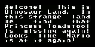Upon entering the overworld, everything seemed normal. Same old level paths, same old music, but the level names were different. Instead of "YOSHI'S HOUSE" like it always has been every time I've ever played Super Mario World, it was now simply just "YOSHI'S". The "HOUSE" part was gone. I thought that this was strange, and I began to lose hope in the hack because it had seemed like barely anything had changed at all from the original. I was hoping to see something new. Well, unluckily for me, I got my wish, as you'll see when you read on. I decided to enter the level out of curiosity. When I entered, the whole house that's normally there was gone. No more smoke, no more fire, no more little birdies, no more treehouse. All that was left was the message box. I decided to hit it. Upon opening, the message I expected to be there was replaced with what seemed like binary.
